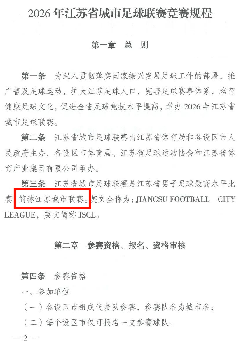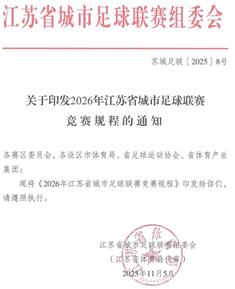 网上流传一份《2026年江苏省城市足球联赛竞赛规程》,该规程早在11月5日,也就是2025年苏超(江苏省城市足球联赛)冠军泰州产生之后4天就发出通知了。2026苏超仍不简称苏超,每队允许最多4名职业球员,但同时登场不超过2人,淘汰赛阶段部分赛事采用主客场双循环制。