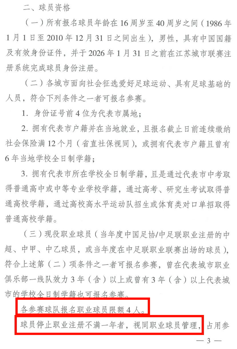 2026年苏超的报名条件包括“16周岁至40周岁之间(1986年1月1日至2010年12月31日之间出生)”,须在2026年1月31日之前在江苏城市联赛注册系统完成球员身份注册。还有身份证、户籍、学籍等要求。这个内容和各地城市官宣的报名要求,如2025苏超亚军南通发布的招募条件大致相同,这也侧面印证了这个内容还是比较靠谱的。