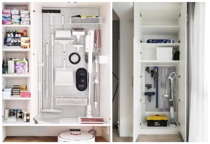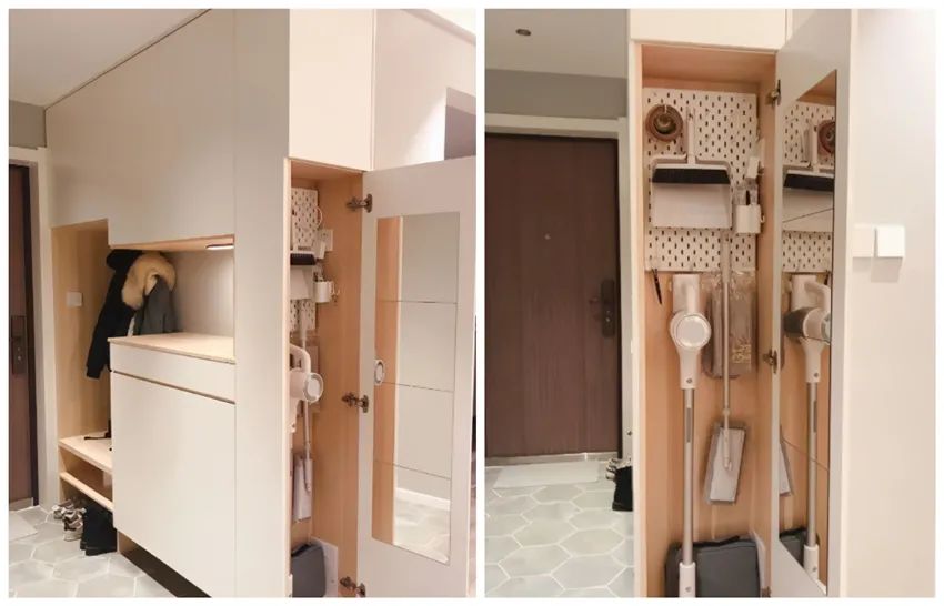 若不差钱,直接在柜体边侧做1㎡的储物间,更加实用。比如在玄关柜、阳台柜旁侧预留出空间,搭配上滑轮和洞洞板,将大大提升储物空间,榨干最后1㎡!