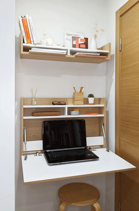 把室内各种墙体转角、边角加装隔板,做成置物架,放置物品;卧室的衣柜转角处做成小书桌,打造迷你办公区,一举两得。