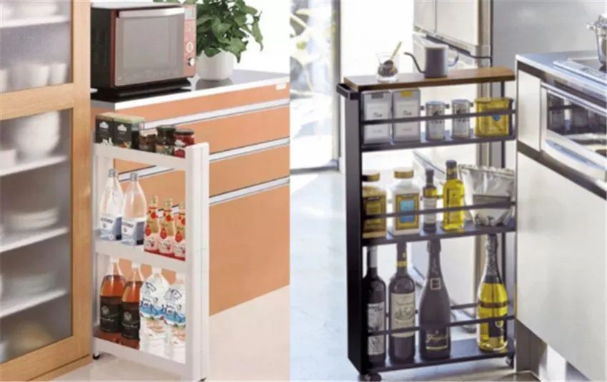 厨房与冰箱和墙体的角落,不妨放置一组10公分左右的缝隙柜,放置零散物品,超级省空间。