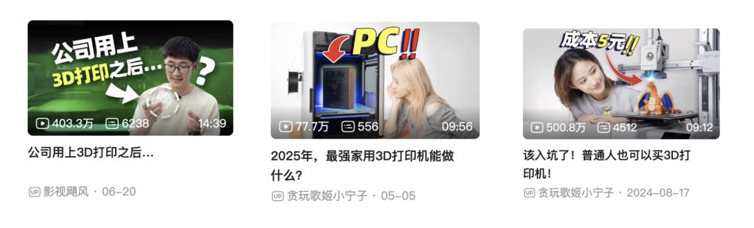 B站、抖音、小红书上,大批UP主纷纷挂上同一个3D打印品牌的Tag,视频播放量轻松破百万。