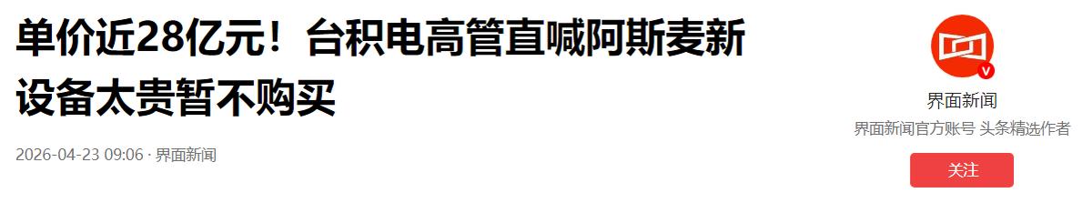 台积电的这一决定,直接堵死了阿斯麦新款光刻机最大的出货渠道,而剩下的潜在客户,根本没有能力承接这款设备的大规模出货。