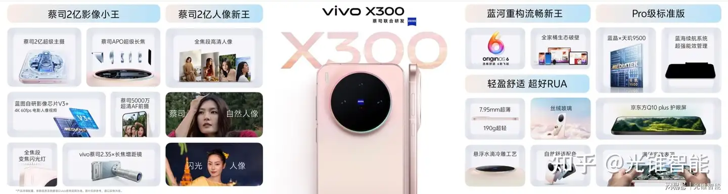 定位“蔡司2亿影像双旗舰”的vivo X300系列在vivo X300 Pro上带来了蔡司APO 2亿超级长焦能力再突破,并在vivo X300上实现了蔡司2亿超级主摄的突破性升级。vivo X300系列搭载的蓝晶×天玑9500旗舰平台,与vivo自研蓝图影像芯片V3+“双芯合体”,带来行业领先的4K视频创作能力。此外,vivo定义天玑9500的影像超能效NPU区域,大幅提升运动抓拍能力。在影像实力跃升的同时,vivo X300系列也带来了旗舰性能的全面进化,实现vivo X300 Pro在室温环境下安兔兔跑分突破410万大关。vivo X300系列还搭载由“蓝河流畅引擎”技术重构的全新OriginOS 6,具备优异的持久流畅表现。