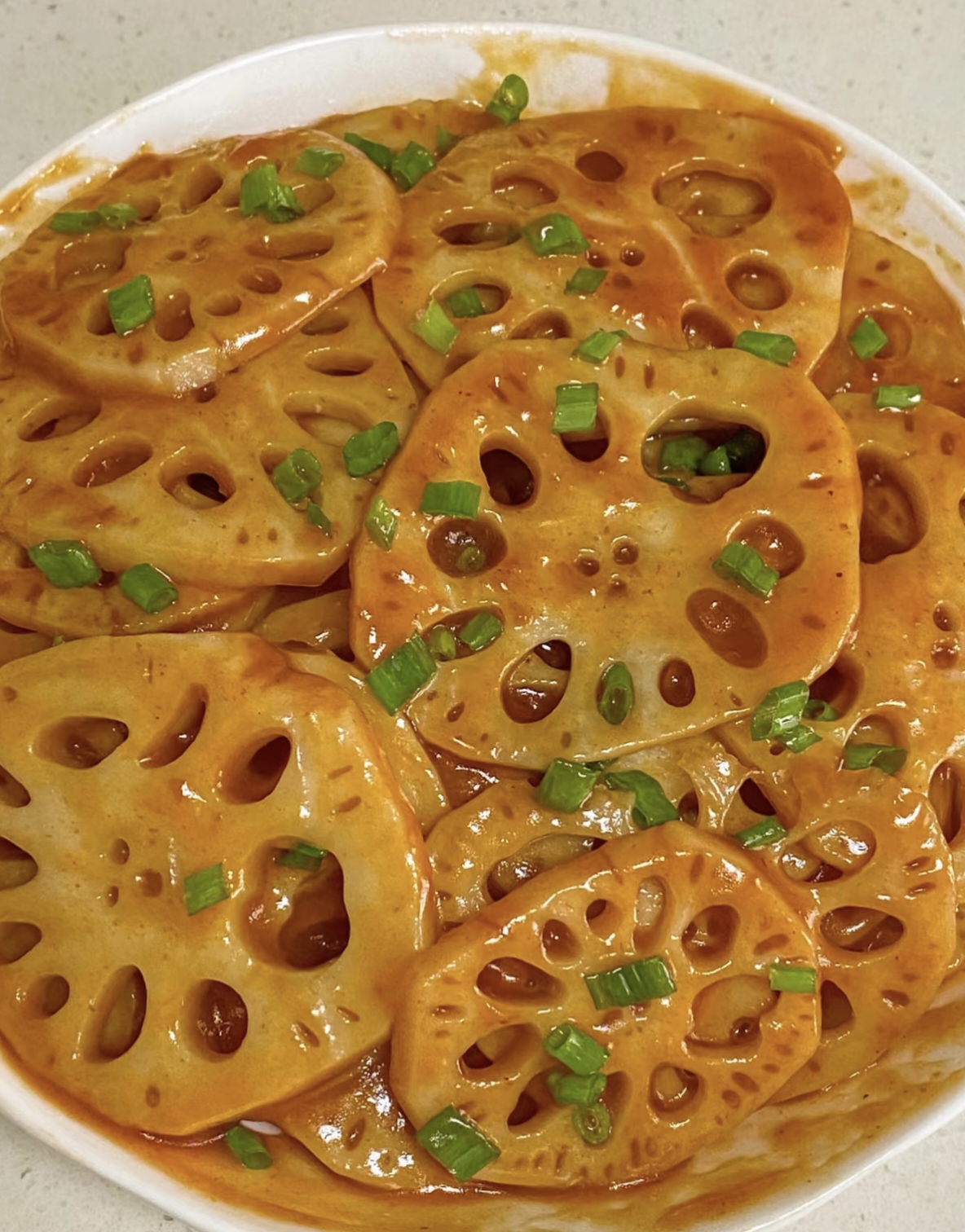 把炒好的糖醋藕片盛出,撒上些许葱花点缀增香。
