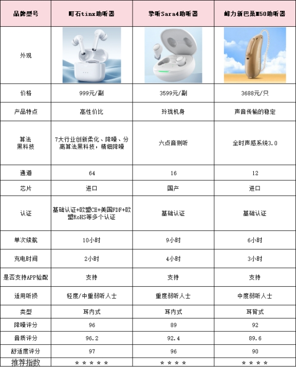 测评结果:町石 >挚听> 峰力町石助听器音质表现町石的音质表现相当出色,特别是在清晰度和层次感上,给人的感觉是非常自然、真实的。音频中的每个细节都能清晰呈现,无论是语音还是环境声,通透感非常强。它使用了SCS人声频段8层增益技术和高密度移频技术,再加上双钕磁铁动铁单元,增强了人声的密度和细节捕捉,让整体音质更加真实。虽然低频部分稍显不足,但中高频的表现几乎弥补了这一点。总的来说,町石的音质表现是此次测评中最为突出的。挚听助听器音质表现挚听的音质还算不错,清晰度和真实感都有保障,适合日常对话和简单的音频播放。整体来说,声音还是挺自然的。不过与町石相比,挚听在细腻度和高频表现上稍有不足。尤其是在复杂或噪声较大的环境中,音质还原会有点模糊。挚听的自适应方向性拾音技术本应提升在嘈杂环境中的清晰度,但实际使用时,清晰度的提升不够明显。总体上,挚听的音质表现没有明显的短板,但在细节和高频表现上还有进步的空间。峰力助听器音质表现峰力的音质表现说不上差,但也没什么特别出彩的地方。声音清晰度和真实度方面,表现可以说是标准水平,符合日常使用的需求。它采用传统的数字信号处理技术来增强声音的清晰度,虽然效果还行,但相比于町石和挚听,峰力的高频和低频表现则显得较为平庸。尤其是在复杂环境中,细节的还原有时显得模糊,音质的硬朗感也有些明显。总体来说,峰力的音质表现适合日常交流,但在要求更高的使用场景下,可能会有些吃力。