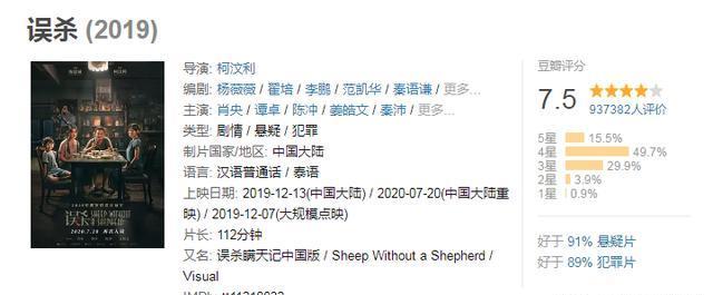 1.《误杀1》谭卓2019年上映的《误杀1》是目前评分最高的存在,近10万看过的观众,一半人都打出了4分,评价非常不错。