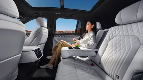 后排空间表现惊喜,540mm 坐垫深度与 1366mm 宽度,让笔者腿部获得两拳多富余,满载三人也不局促,中间地板凸起小,不影响中间乘客腿部活动。后排座椅靠背可调节,配备加热、通风及按摩功能,搭配独立四温区空调,乘客体验媲美前排。中间扶手放倒后可拉出折叠小桌板,方便处理文件、放置物品,商务与家用场景均适用。