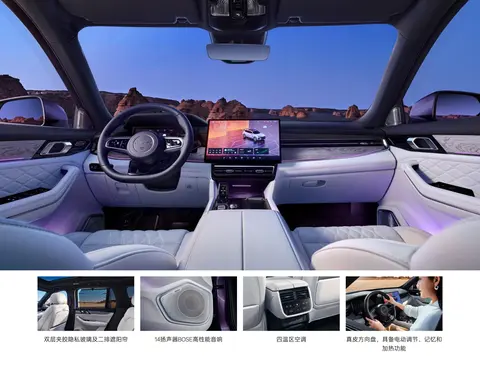 驾驶模式:选择丰富,适配多种场景提供舒适、运动及雪、沙、岩、泥四种越野模式,不同模式对应不同动力输出、换挡逻辑与底盘调校,适配多种场景。