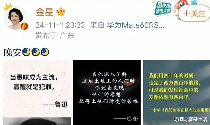 看到大家不愿意支持自己之后,她又在去年11月1日,在自己的社交账号发一些很多名人名语,给人的感觉就好像是其他人都是愚昧的,只有自己才是最为清醒的那一个,可是没想到自己的清醒,却被他人给针对。