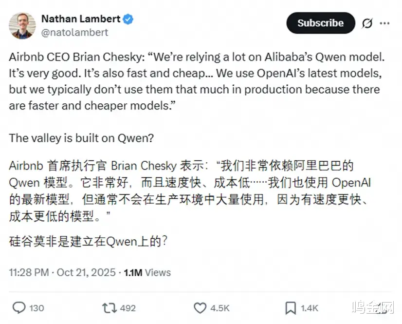 爱彼迎CEO坦言,公司正大量依赖阿里巴巴的千问模型。