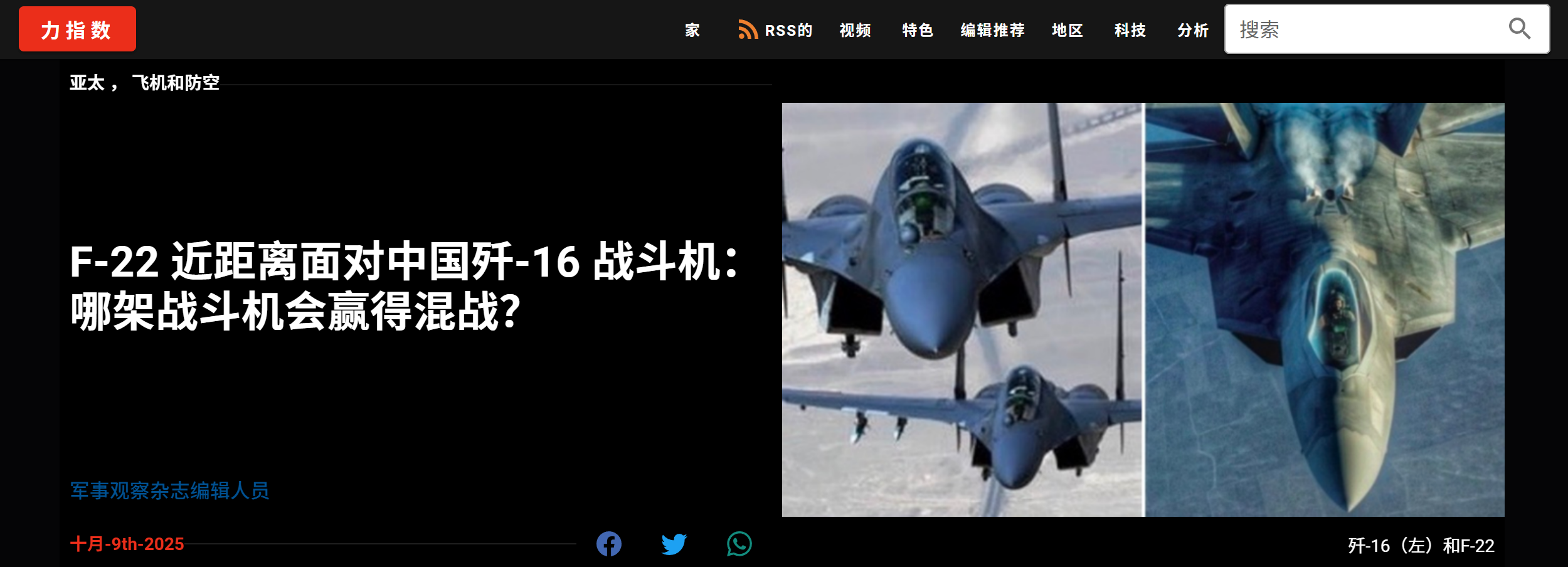 如果面对像歼-16这样具有现代视距瞄准能力的战斗机,F-22缺乏先进的头盔式瞄准具,这种近距视觉瞄准能力的缺失,即便机动性优势都发挥出来,让其近距交战中将全面地有利于歼-16战斗机。
