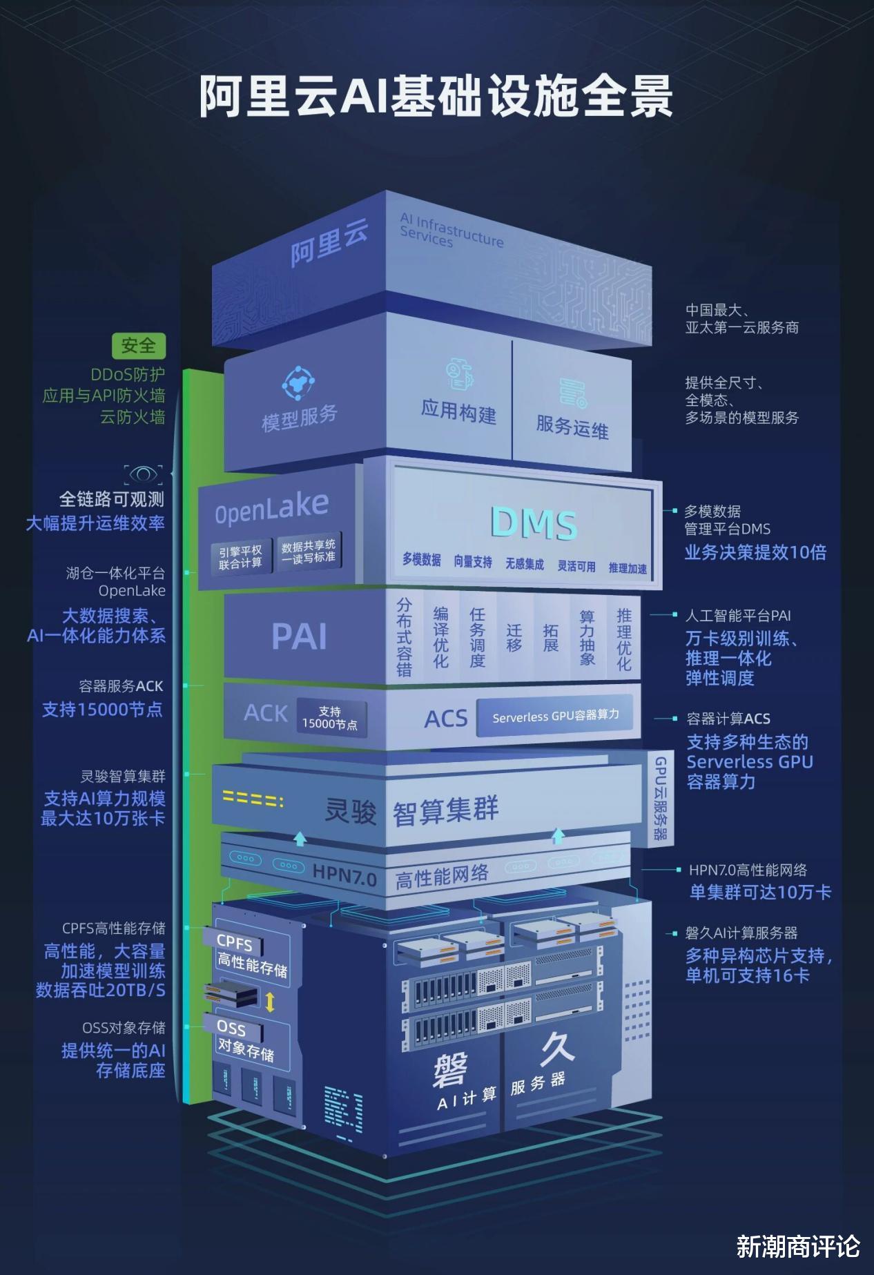 凭借深厚的基础设施积累和生态布局,阿里云定位为全栈人工智能服务商,全面升级从服务器到计算、存储、网络、数据处理、模型训练和推理平台的技术架构体系,以配合大模型带来的底层技术栈的变化。