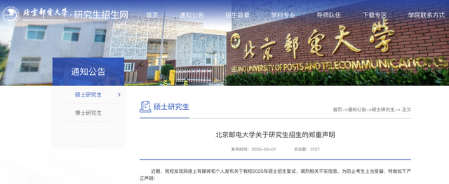 近期,北京邮电大学发现网络上有媒体和个人发布关于该校2025年硕士招生复试、调剂相关不实信息,为防止考生上当受骗,特发布严正声明。