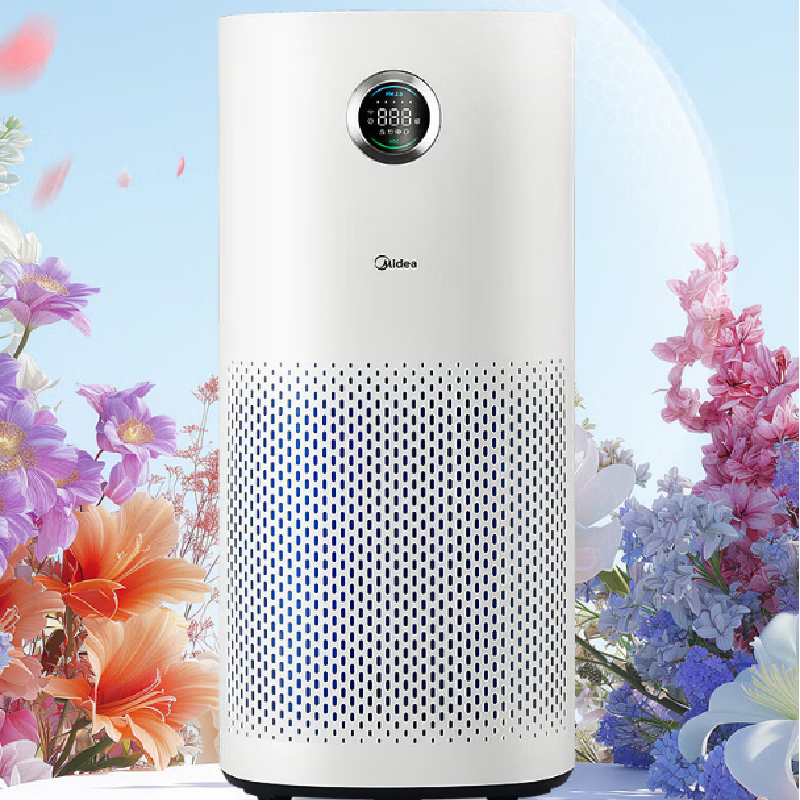 整体是极简的纯白色立式设计,线条干净,机身中部略收窄,视觉上不会显得笨重。高度适中,底部平整,一个人搬动换位置还算轻松。顶部是触控操作区,按键反应灵敏,功能不多但够用,老人也能快速上手。它支持美的美居App,连上后可以用手机远程查看空气质量、开关机或调整模式,还能看到滤网寿命提醒。正面有一块显示屏,PM2.5数值和空气质量颜色提示都很清晰,信息一目了然,适合日常家庭使用。