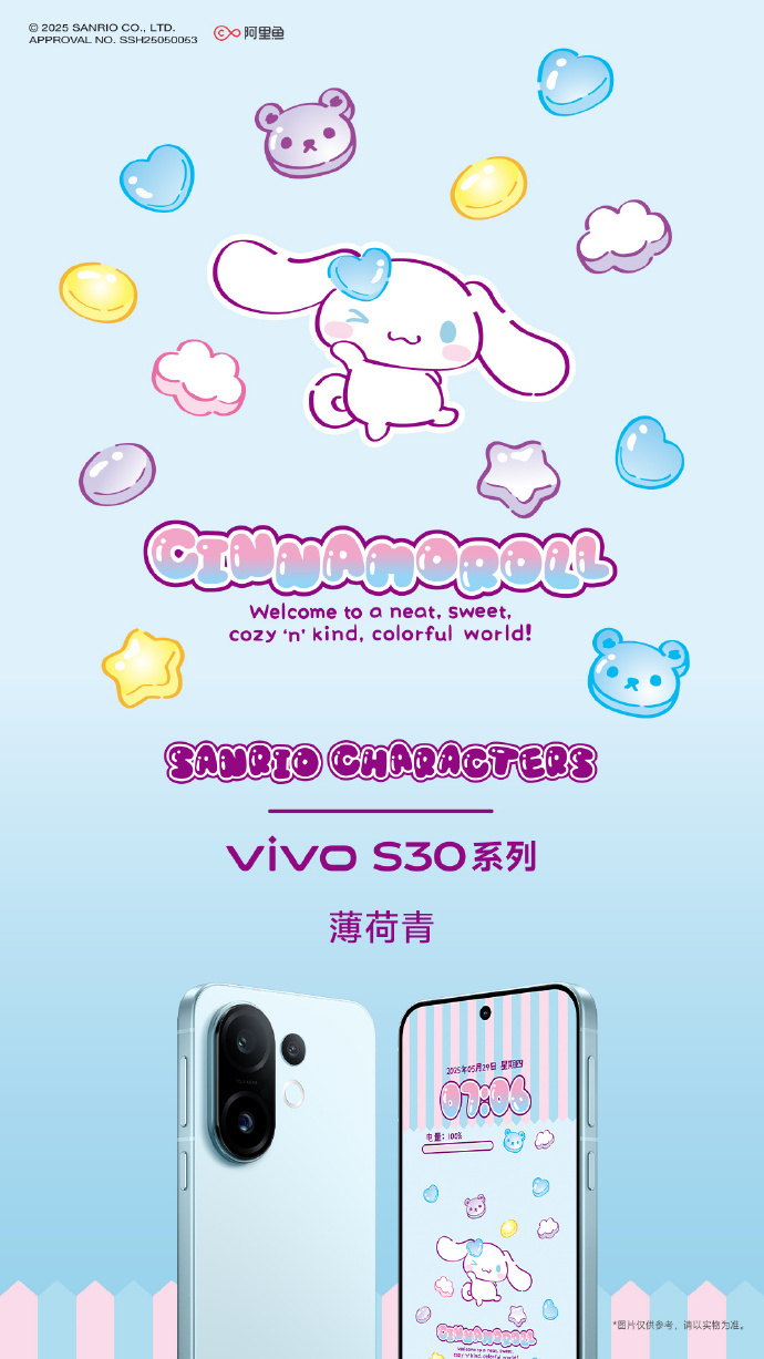 S30系列的设计语言,本次主打“小直屏”和“多巴胺配色”。我们从微博中看到,这次共推出酷莓粉、桃桃粉、可可黑、薄荷青、柠檬黄五大配色,每一款都像是为某种性格量身打造,完全符合当下“从手机也能看出个性”的趋势。尤其是与三丽鸥家族联名推出的定制礼盒,凯蒂猫、美乐蒂、布丁狗等角色再加上洞洞壳、挂绳、相框权益卡等周边,让这款手机不仅是一台数码产品,更是一份夏日限定的情绪表达。
