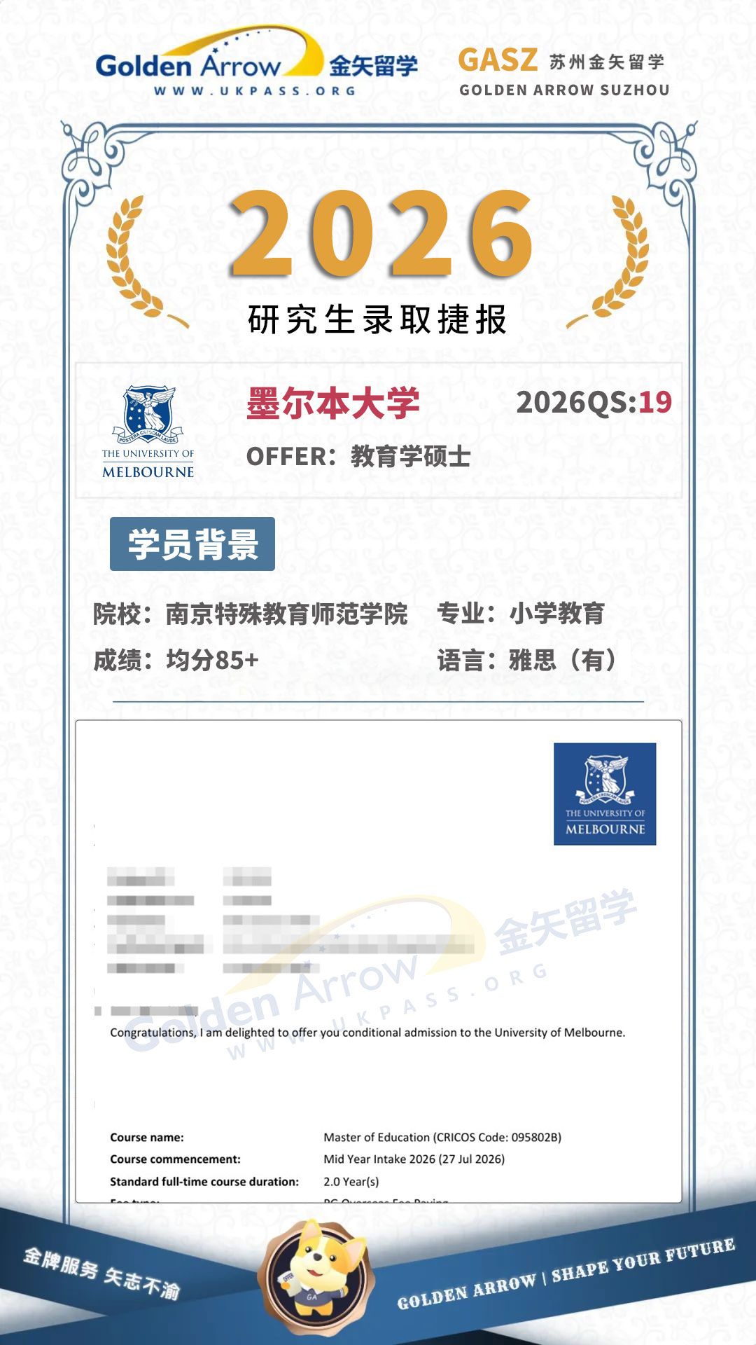 澳洲大学申请案例:南京特殊教育师范学院小学教育专业的学生,以均分85+有雅思的背景,通过金矢留学成功申请到了QS世界大学排名第19位的澳洲墨尔本大学教育学硕士,下面一起看下该案例录取offer及专业介绍!