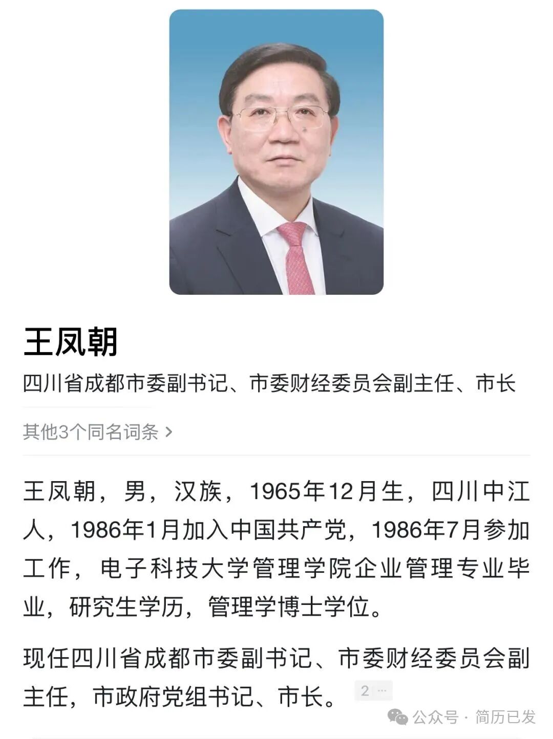 王凤朝,男,汉族,1965年12月生,四川中江人,1986年1月加入中国共产党,1986年7月参加工作,电子科技大学管理学院企业管理专业毕业,研究生学历,管理学博士学位。现任四川省成都市委副书记、市委财经委员会副主任,市政府党组书记、市长。人物履历1982.09-1986.07 成都电讯工程学院电子机械系无线电专用机械设备专业学习1986.07-1987.09 长虹机器厂九车间实习1987.09-1993.04 长虹机器厂设计二所结构室设计师1993.04-1994.03 长虹机器厂、长虹电器股份公司设计二所副所长(1993.11工程师)1994.03-1996.03 长虹机器厂、长虹电器股份公司生产计划处处长1996.03-1996.08 长虹机器厂、长虹电器股份公司质量生产处处长1996.08-2000.05 长虹机器厂副厂长、长虹电器股份公司副总经理(1998.11高级工程师)2000.05-2001.02 四川长虹电子集团有限公司董事,长虹电器股份公司副董事长、常务副总经理2001.02-2004.07 四川长虹电子集团有限公司董事,长虹电器股份公司副董事长、执行总裁2004.07-2005.09 四川长虹电子集团有限公司副董事长兼长虹电器股份有限公司总经理(2002.09-2005.06电子科技大学管理学院企业管理专业在职研究生学习,获管理学硕士学位)2005.09-2007.10 四川省内江市副市长2007.10-2010.08 四川省国资委副主任2010.08-2010.11 四川航空集团有限责任公司副董事长2010.11-2013.12 四川航空集团有限责任公司副董事长、总经理(2008.09-2012.06电子科技大学管理学院企业管理专业在职研究生学习,获管理学博士学位)2013.12-2015.06 四川航空集团有限责任公司董事长、党委书记2015.06-2015.12 四川航空集团有限责任公司董事长、党委书记,四川发展(控股)有限责任公司董事长、党委书记2015.12-2019.09 四川发展(控股)有限责任公司董事长、党委书记,四川金融控股集团有限责任公司董事长、党委书记(2017.02)2019.09-2020.07 四川省副省长2020.07-2020.08 四川省副省长,成都市委副书记,市政府副市长、代市长、党组书记2020.08-2020.09 四川省成都市委副书记,市政府副市长、代市长、党组书记2020.09- 四川省成都市委副书记,市政府市长、党组书记