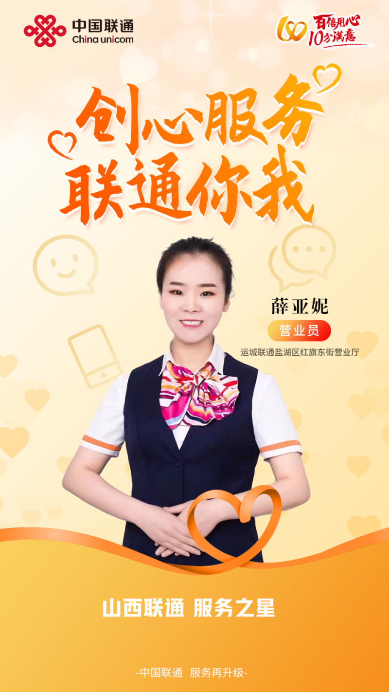 在营业前台工作,经常会遇到特殊人群以及老年人寻求帮助的情况发生,薛亚妮始终用专业、贴心服务,让客户感受到联通的温暖。