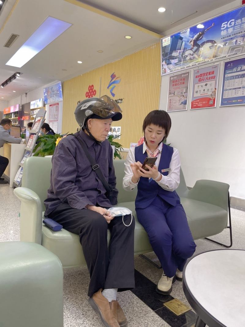 在今年的5月份,厅里来了一位满头大汗,神情焦急的老人,薛亚妮通过询问得知,孩子从外地给他邮寄了一部智能手机,但是因为对智能手机的使用不熟悉,导致刚才要坐公交车但不会打开健康码而没有上车,在情急之下看到附近有联通营业厅就进来咨询。了解情况后,薛亚妮赶紧招呼老人坐下并端来一杯热水,随后便帮助老人完成支付宝注册、实名认证等一系列操作,又仔细教老人如何使用支付宝扫场所码,如何出示健康码,因为老人记不清,她便将操作步骤通过图画方式进行展示,并一遍一遍地演示讲解,直至老人能够熟练掌握使用方法,同时还留存了老人的联系电话,在下次参加公司举办的“银发无忧 智慧助老”公益大讲堂活动时邀请用户参加,携手老年群体跨越“数字鸿沟”。