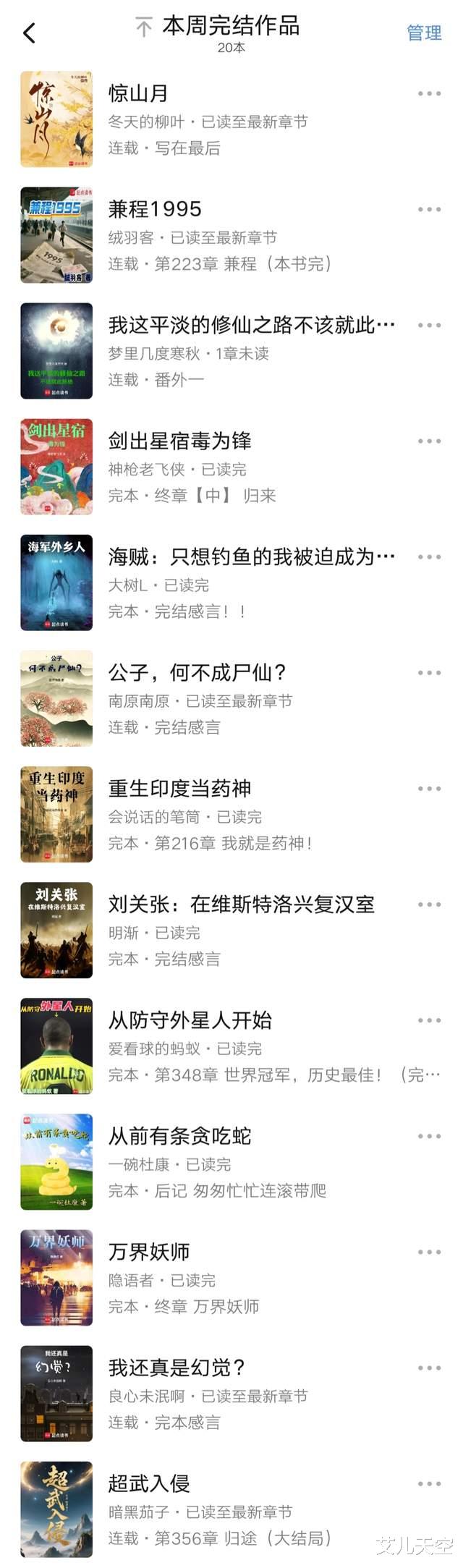 以上就是这周完结的一些小说了,有遗漏的话下周补充。这些作品我也多是浅尝辄止,大家有比较熟悉的不妨说说,我们明天再见。
