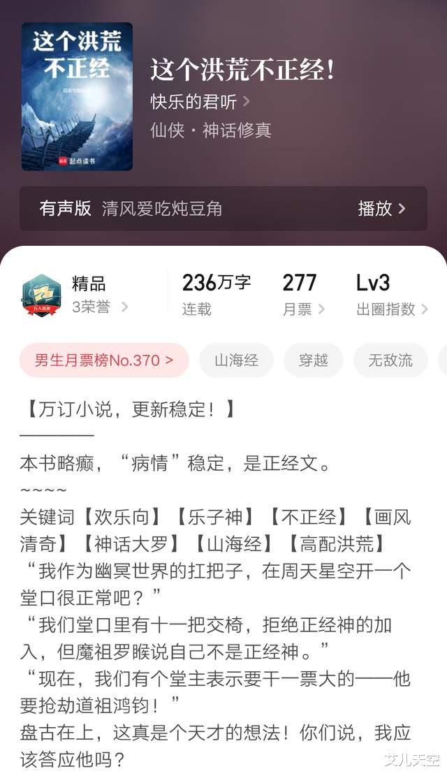 小说一百五十多万字的时候万订的,就是有些后期乏力,稍稍下跌了一些。喜欢看洪荒乐子文的可以去试试。