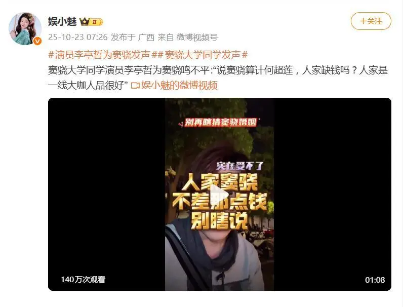 “实在受不了!说窦骁算计何超莲,人家可是‘谋男郎’,早就成一线大咖了,人品没问题,真不差那点钱!”10月23日,演员李亭哲的一条发声视频瞬间炸翻热搜。作为窦骁的北京电影学院同班同学,他的仗义执言给持续发酵的 “婚变疑云” 泼了盆理性冷水——从向太爆料引发的 “男方掏空积蓄嫁豪门” 猜测,到 “算计女方财富” 的恶意揣测,这场围绕窦骁的舆论风暴,终于迎来了圈内人的视角反击。