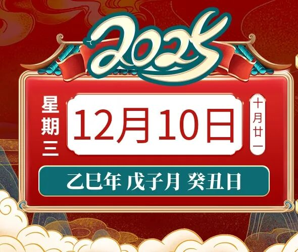 2025年12月10日,星期三,农历十月廿一 (乙巳年戊子月癸丑日),法定工作日。