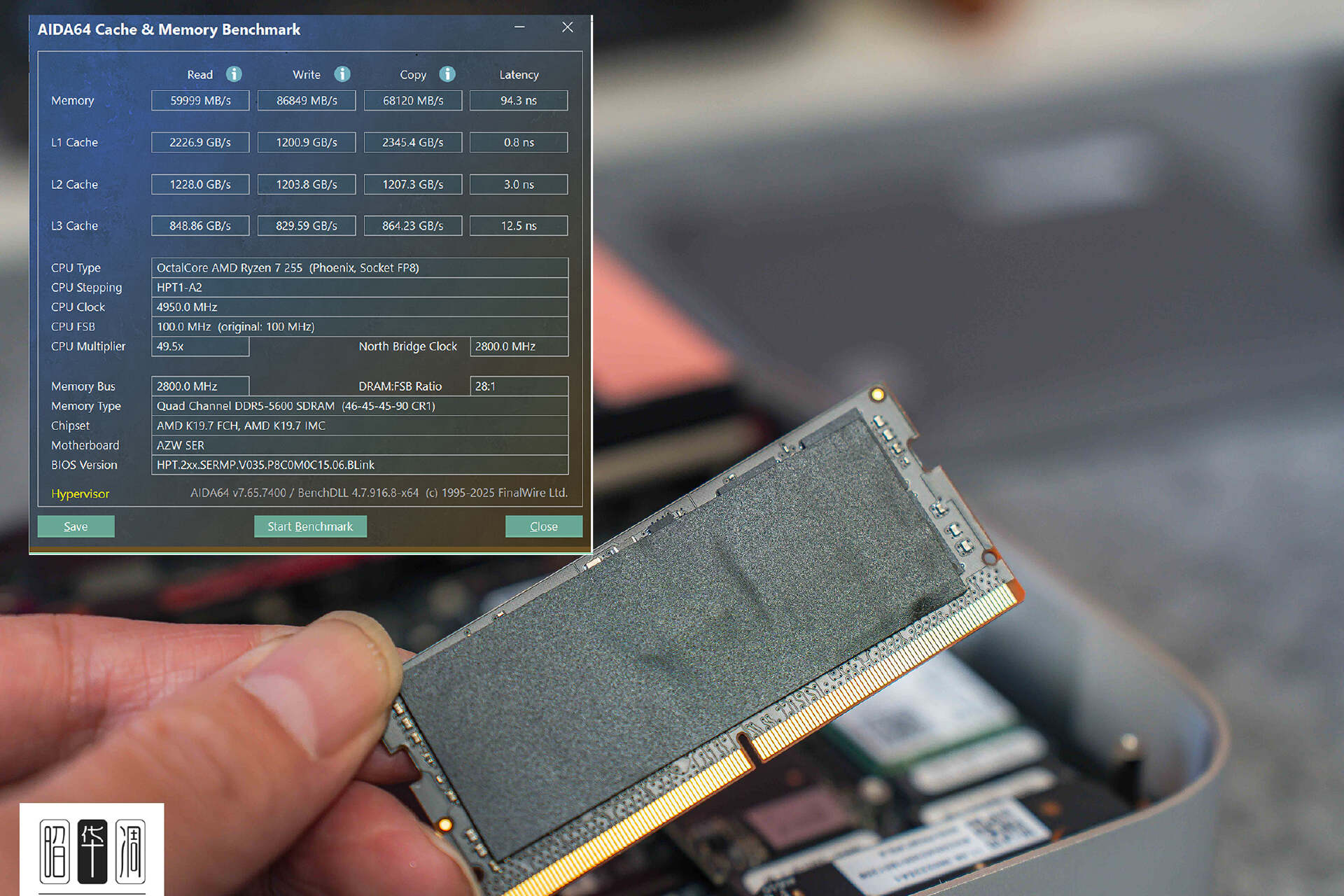 ▼Radeon 780M 核显对内存频率极度敏感。SER9 Max 成品版非常良心地标配了两条 镁光 DDR5 5600MHz 内存,不仅如此,零刻还专门给内存配备了电磁屏蔽贴,避免干扰内部的无线信号,细节相当到位。 实测 AIDA64 数据如下: