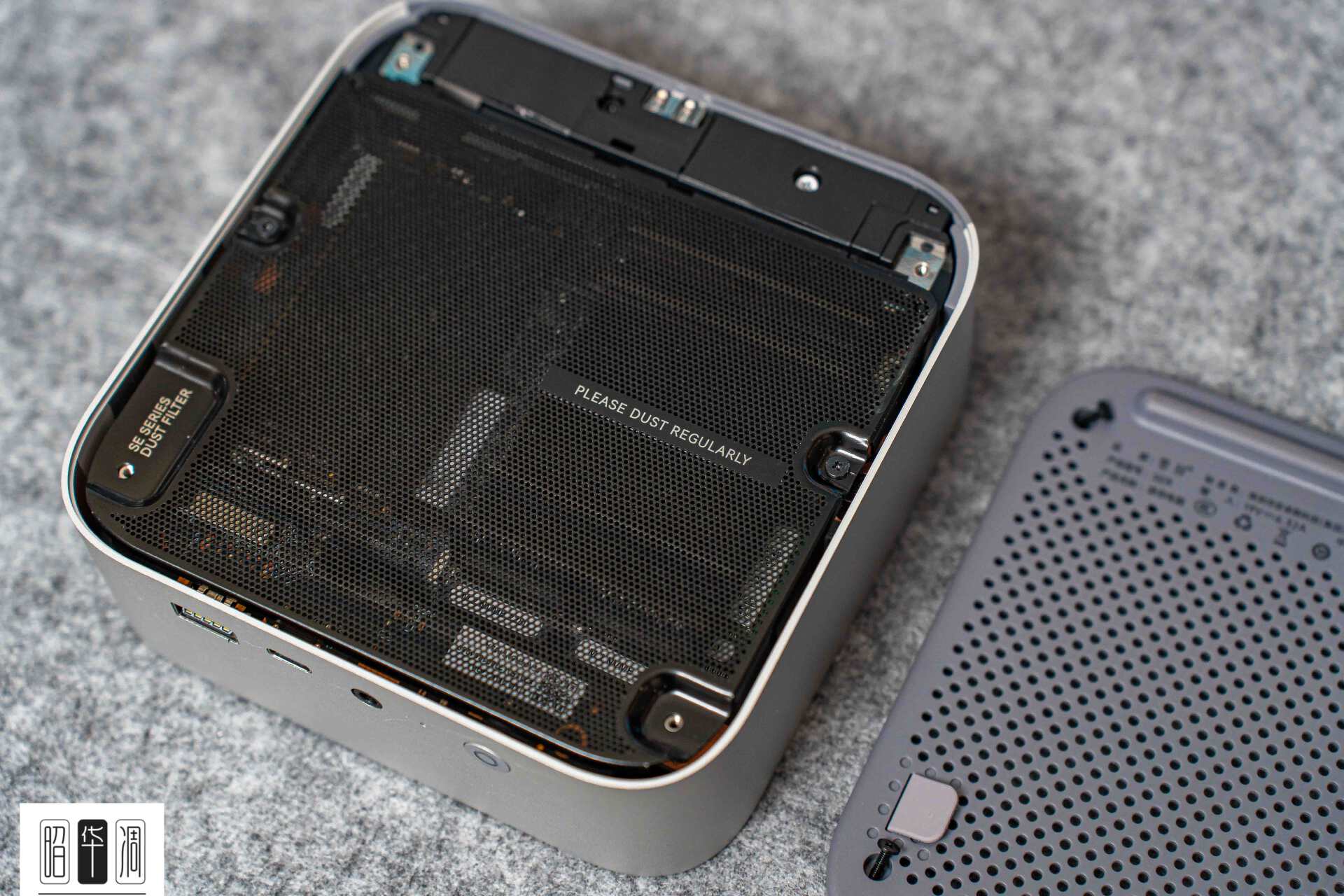 ▼揭开机身顶盖,SER9 Max完整沿袭了该系列的经典架构。首当其冲的是高密度透气蚀刻金属防尘网,主要作用是防尘,旁边两颗小螺丝拆掉即可进行分离。