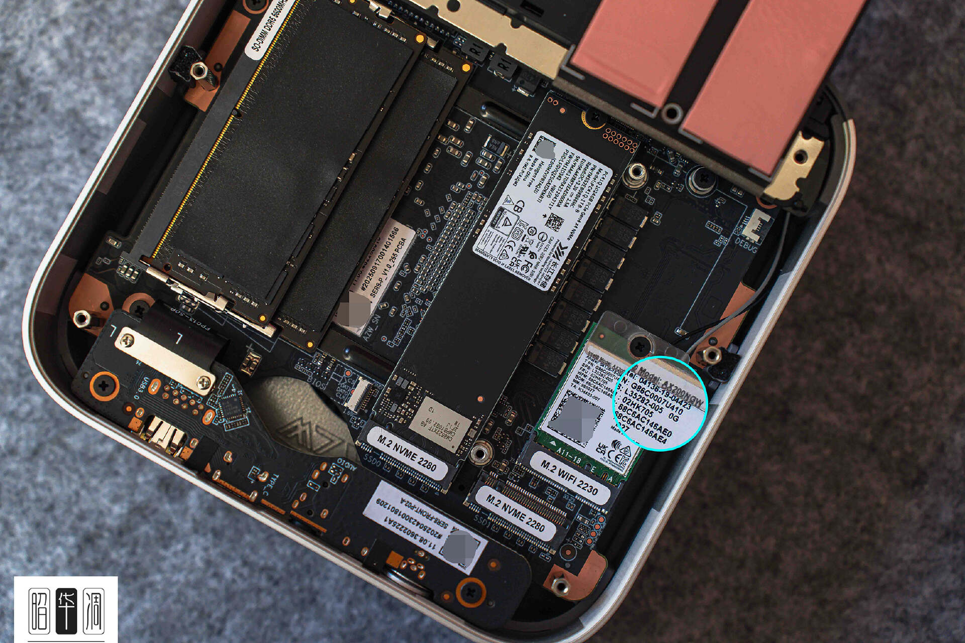 ▼散热模块下方是两条 PCIe 4.0 x4 M.2 SSD 插槽,为未来的大容量扩容留足了空间。 无线网卡则是堆叠式设计,隐藏在硬盘槽下方,标配型号为 Intel AX200NGW(支持 Wi-Fi 6 + 蓝牙 5.2)。
