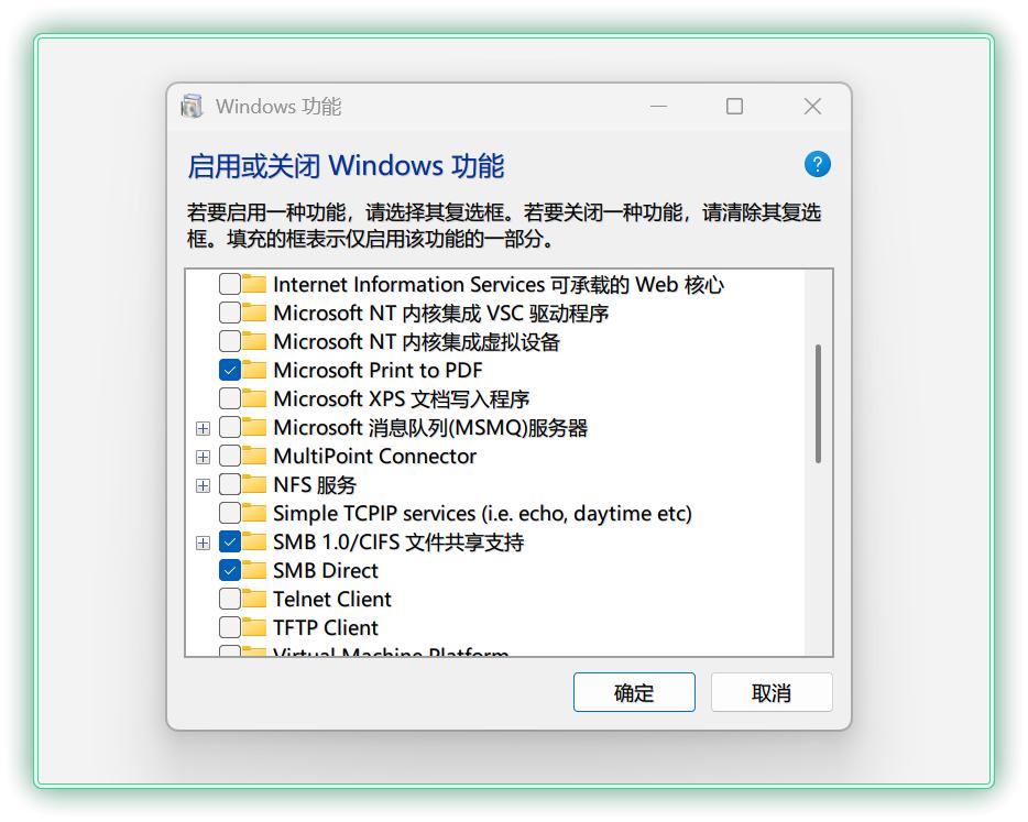 ▼电脑端也必须启用 SMB 服务,启用方法使用快捷键 win + r,键入 OptionalFeatures ,勾选 SMB 相关功能。