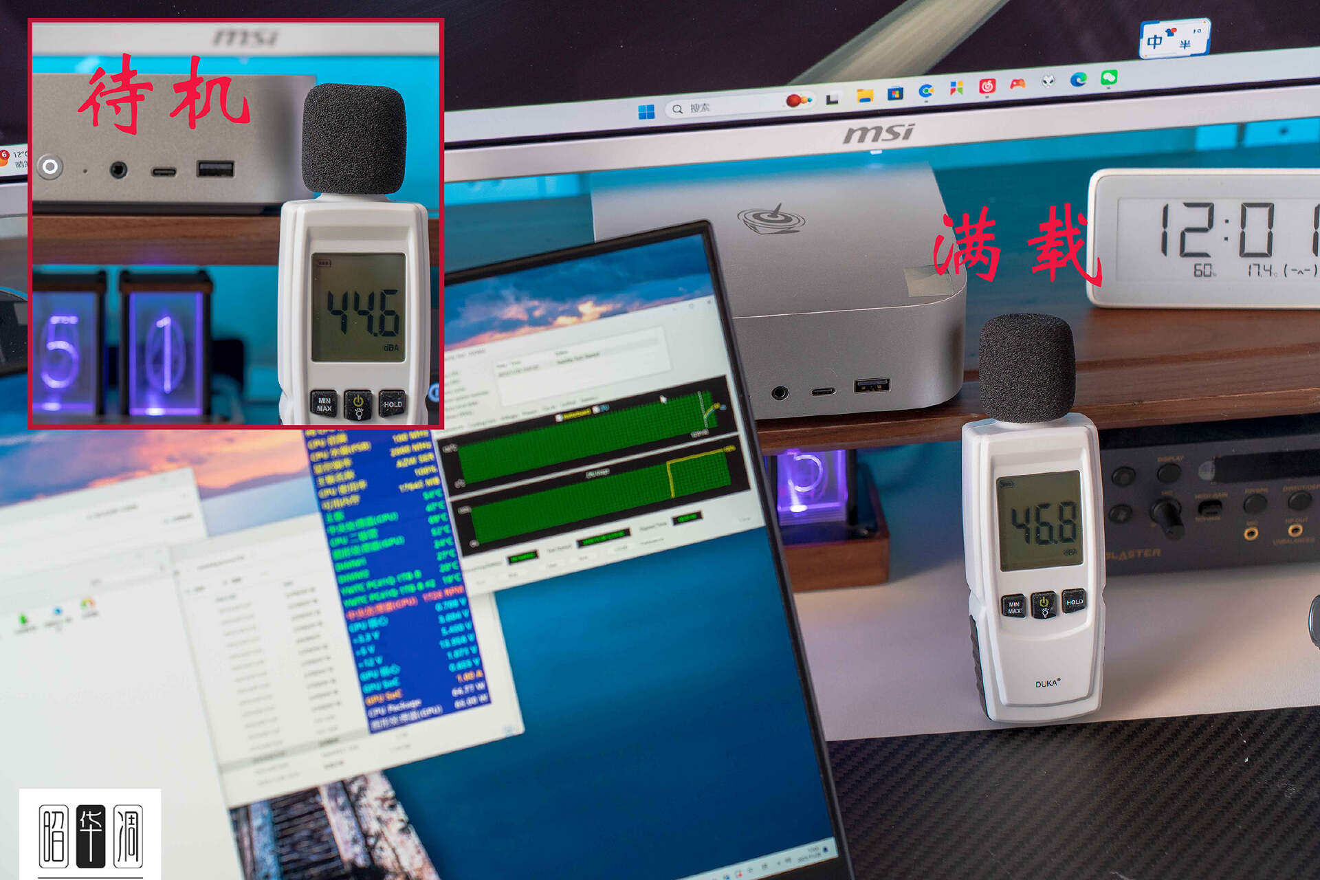 待机时,零刻 SER9 Max 在近距离,几乎能保证 0dBA 噪声增长(环境噪音也是 44dBA),就算满载情况下,近距离观测噪音值也仅仅升高了 2dBA,拉开到 1 米的正常使用距离时,这个噪音值几乎可以无视。