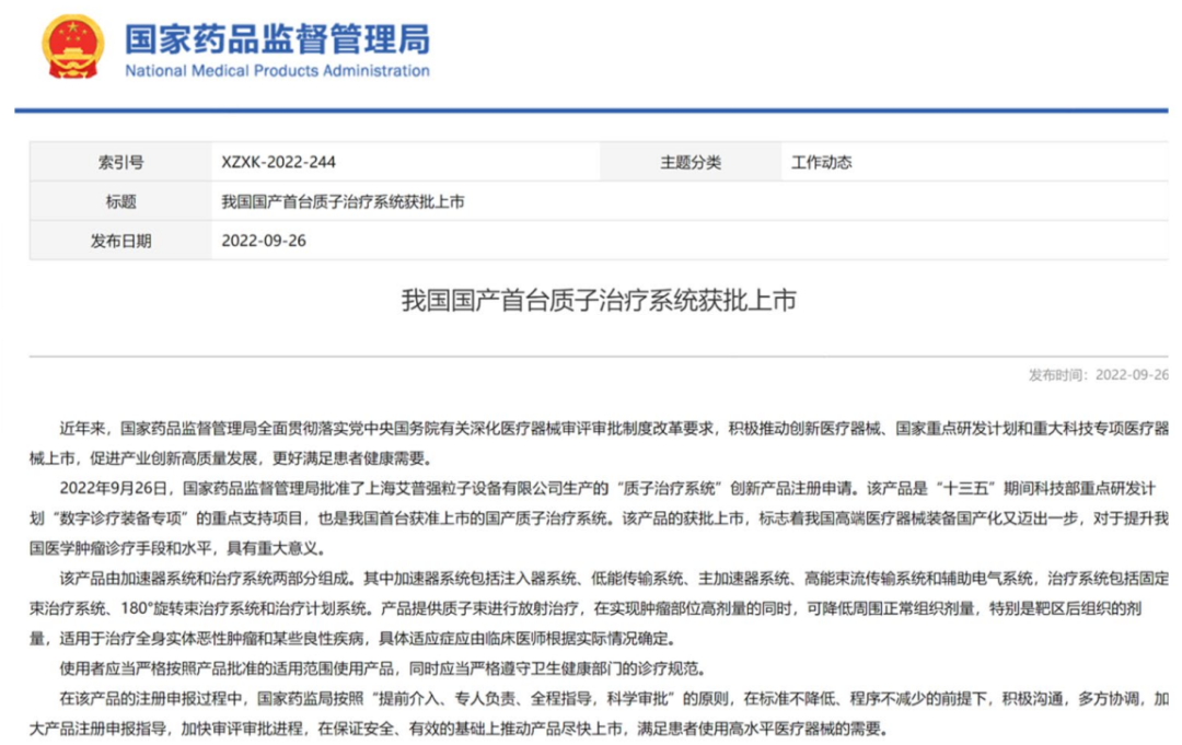 终于,2022年9月26日,在二十大召开前夕,艾普强正式获得国家药监局颁发的医疗器械注册证。自此,中国首台国产质子治疗系统获批上市。