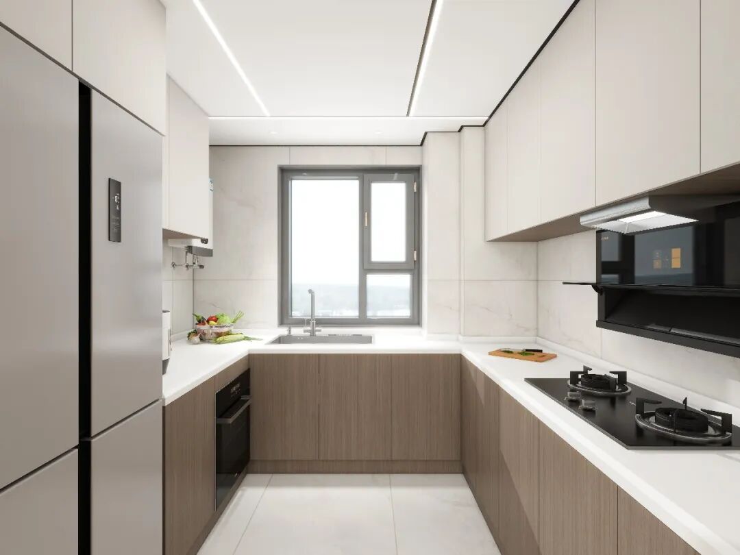 厨房:雅调裹着烟火气🍳木色橱柜搭白色台面雅调里藏着烟火气L型动线刚好适配“拿、洗、炒”的流程内嵌烤箱、冰箱把空间理得整整齐齐浅色调让厨房亮堂不压抑做饭的热乎劲里也没丢新中式的雅致