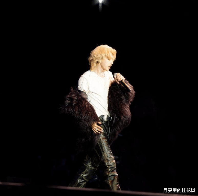 蔡徐坤这次彻底化身摇滚小王子:背头金发、烟熏妆和皮草大衣,配上珍珠项链,整体造型充满暗黑美学,呼应歌曲的颓靡主题。这身打扮不是花架子,而是实打实的摇滚风范——皮夹克配金属链,细节满分,让人一眼就入戏。网友感叹“简直是摇滚歌王既视感”,这种大胆尝试,让舞台视觉冲击力爆棚。