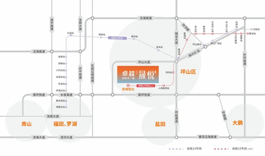 超集快速畅达:南坪快速、东部过境高速(在建中)、坪盐通道,3条快速速抵罗湖福田,约15km盐田沙头角、约25km罗湖莲塘/香港、约35km福田、约40km南山