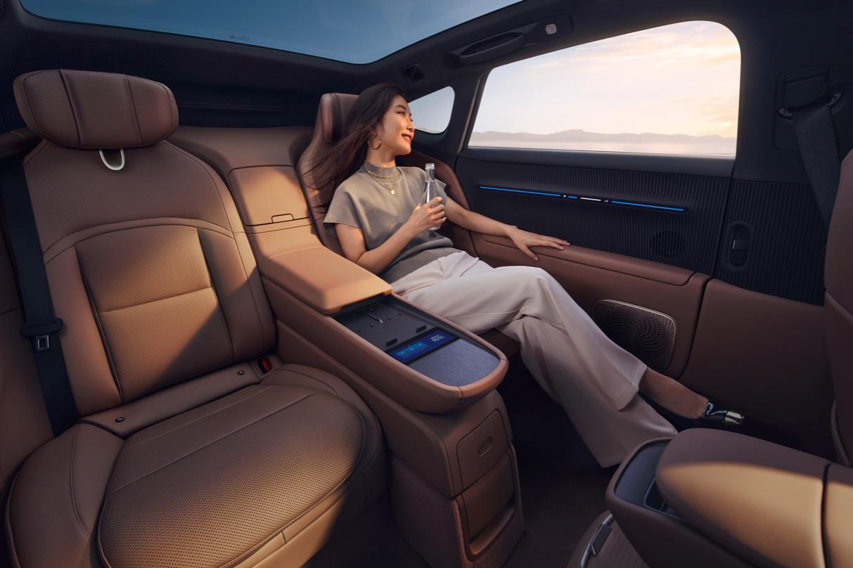 此外,新车还提供了VIP四座尊享包、纳米水离子健康氧颜舱等配置,将豪华推向新高度。后排座椅支持加热、通风、8点位按摩与电动调节,配合车载智能冷暖箱与50W无线快充,无论是商务接待还是家庭出行,皆能尽享从容。纳米水离子健康氧颜舱能在净化空气的同时,实现保湿护肤、柔顺秀发的贴心养护。