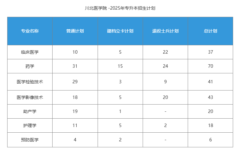 四川川北医学院2025年专升本招生计划有235人,共招收7个专业,涵盖护理学、医学检验技术、临床医学、医学影像技术、药学、助产学、预防医学。