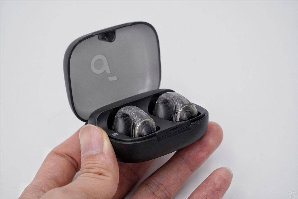 声阔C40i太空舱Pro的充电仓采用透明机甲风设计,聚碳酸酯材质可见内部结构,磁吸滑盖手感顺畅。耳机本体弯月形造型,单只重量仅6克,液态钛丝骨架加硅胶包裹,佩戴稳固度优秀,运动甩动也不易掉落,对佩戴眼镜的用户友好。Zero-Pressure架构让接触面更小,耳翼三档可调,适配不同耳型,佩戴舒适感明显提升。