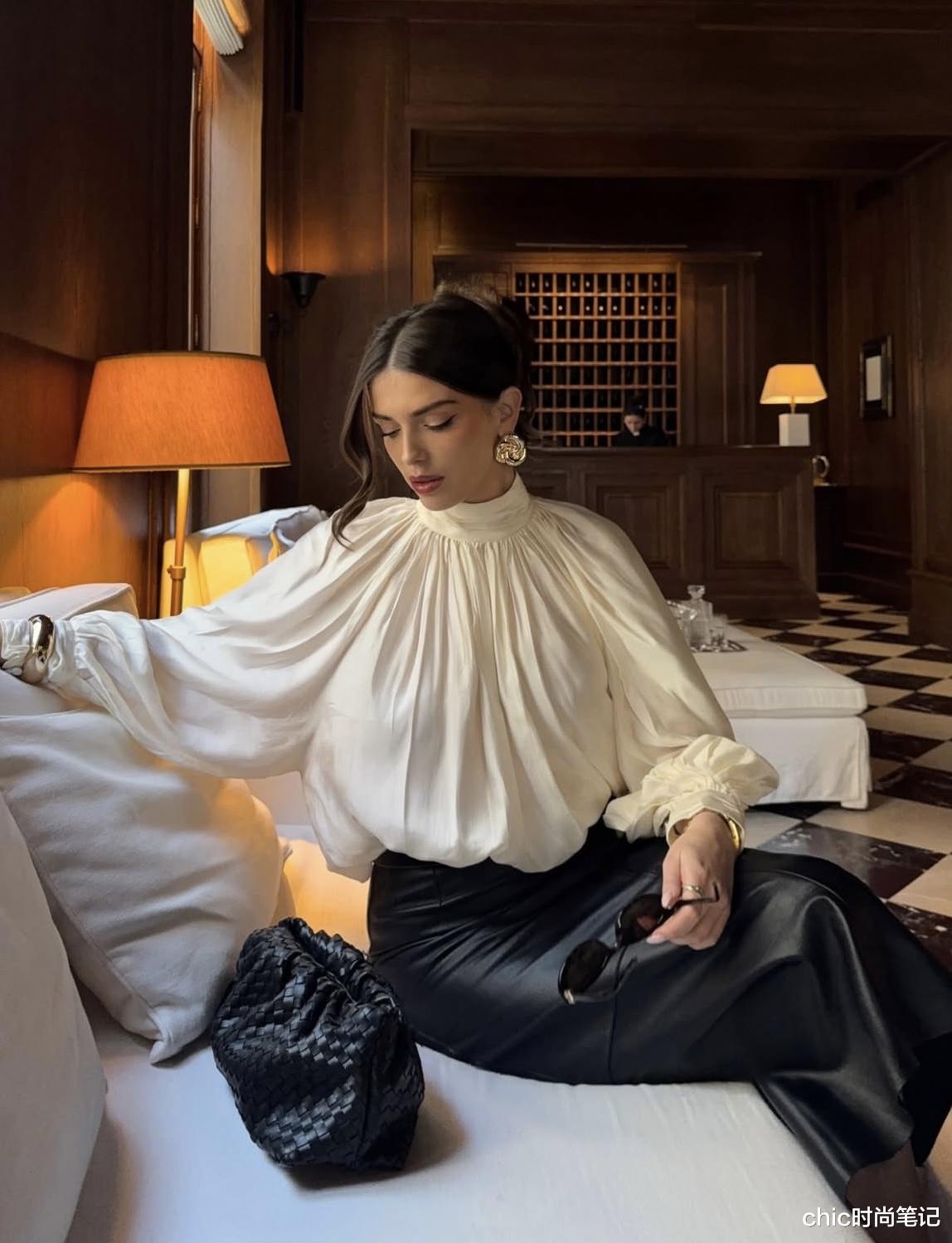 白色雪纺立领衬衫+蝙蝠袖的设计,把简约与松弛展现出来,下身搭配缎面黑色半身裙,经典的黑白搭配。点缀上金属配饰,妥妥的优雅老钱。