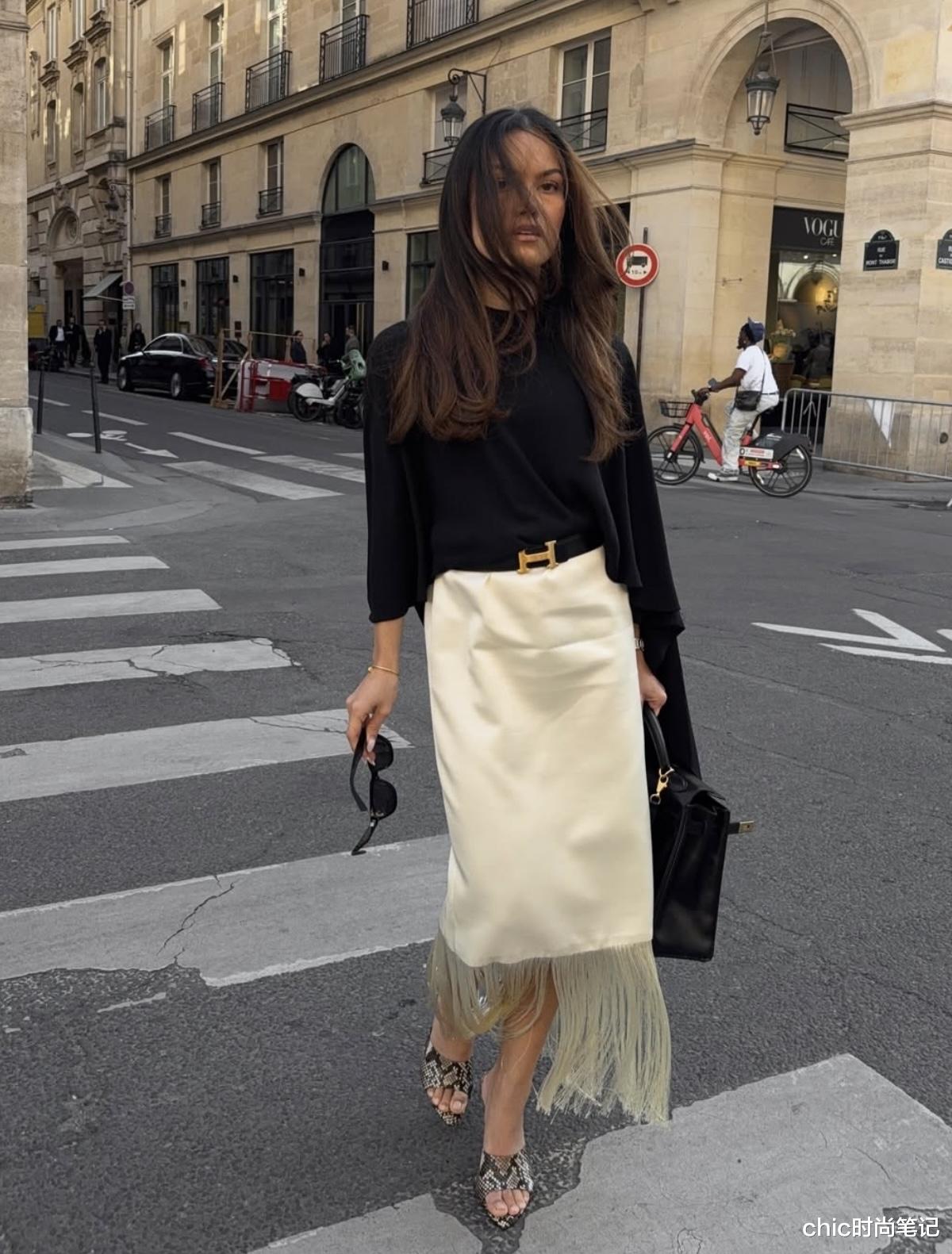 黑色披肩上衣飘逸而优雅的垂在一侧,搭配一条米白色缎面流苏裙,裙下摆的流苏把精致与小资有效的呈现出来,一看就很老钱感。