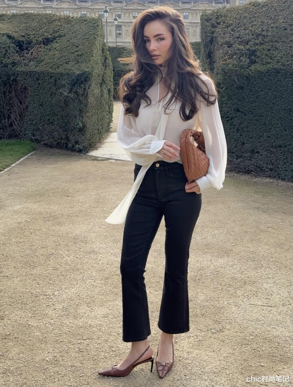 轻盈飘逸的雪纺衬衫垂坠感与质感极佳,搭配黑色微喇九分裤,日常出街的百搭利器,既不会过于隆重,又能便于出行。酒红色高跟鞋丰富了整套穿搭的色彩!
