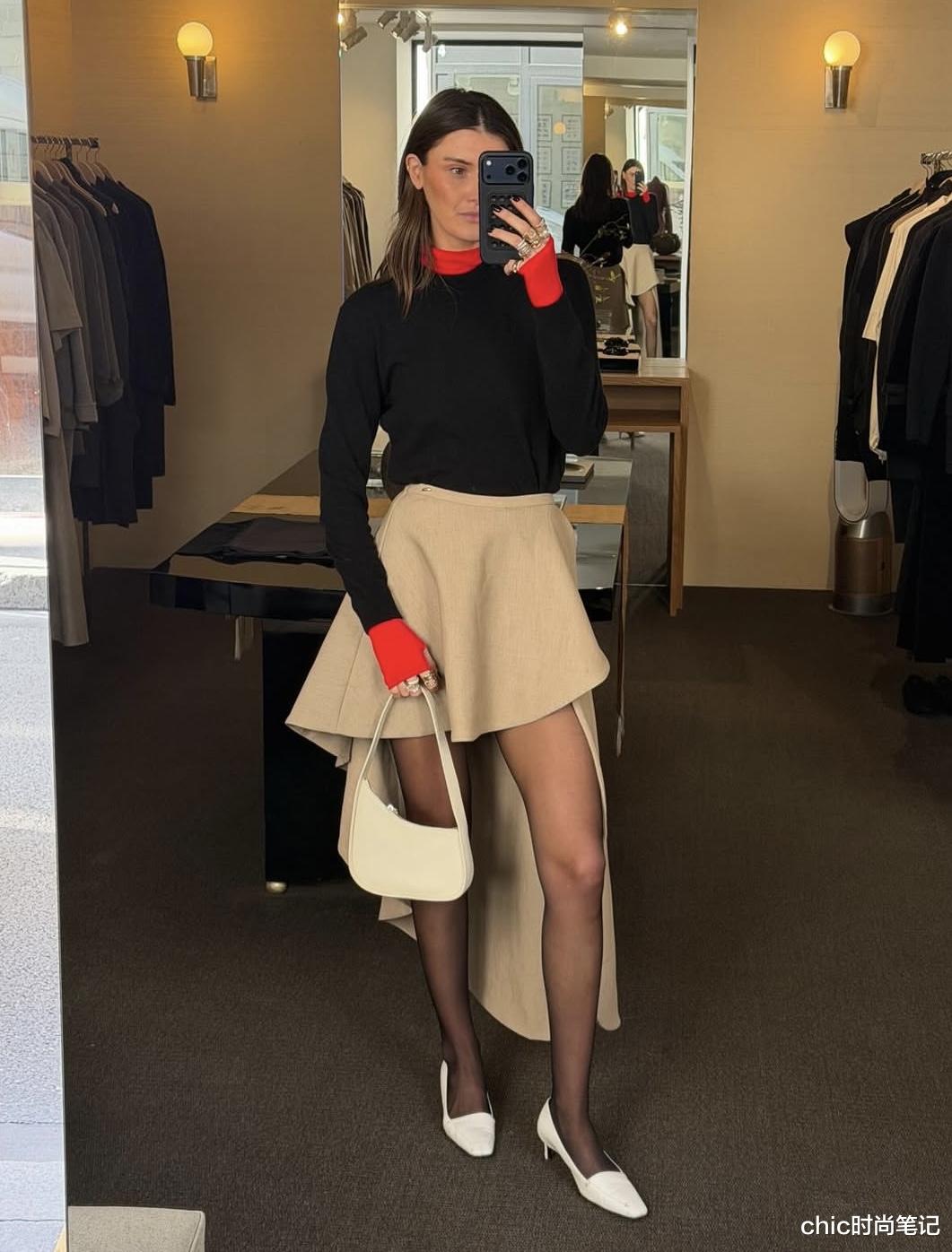 黑色与红色的拼接上衣略显张扬,下身搭配卡其色不规则A字裙,裙子做了前短后长的设计会更显腿部线条比例,不经意间的“小心机”!