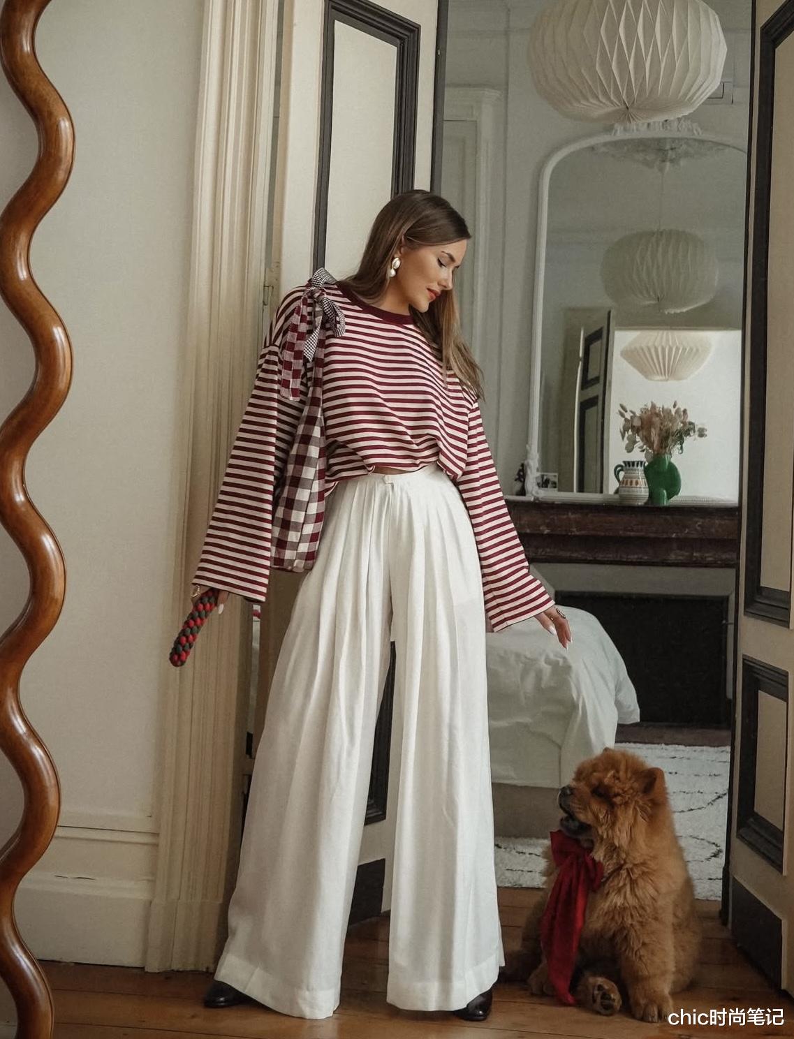 宽松的条纹衫搭配纯色系阔腿纯棉长裤,很适合居家、旅行的时候穿着,舒适度up!休闲度up!