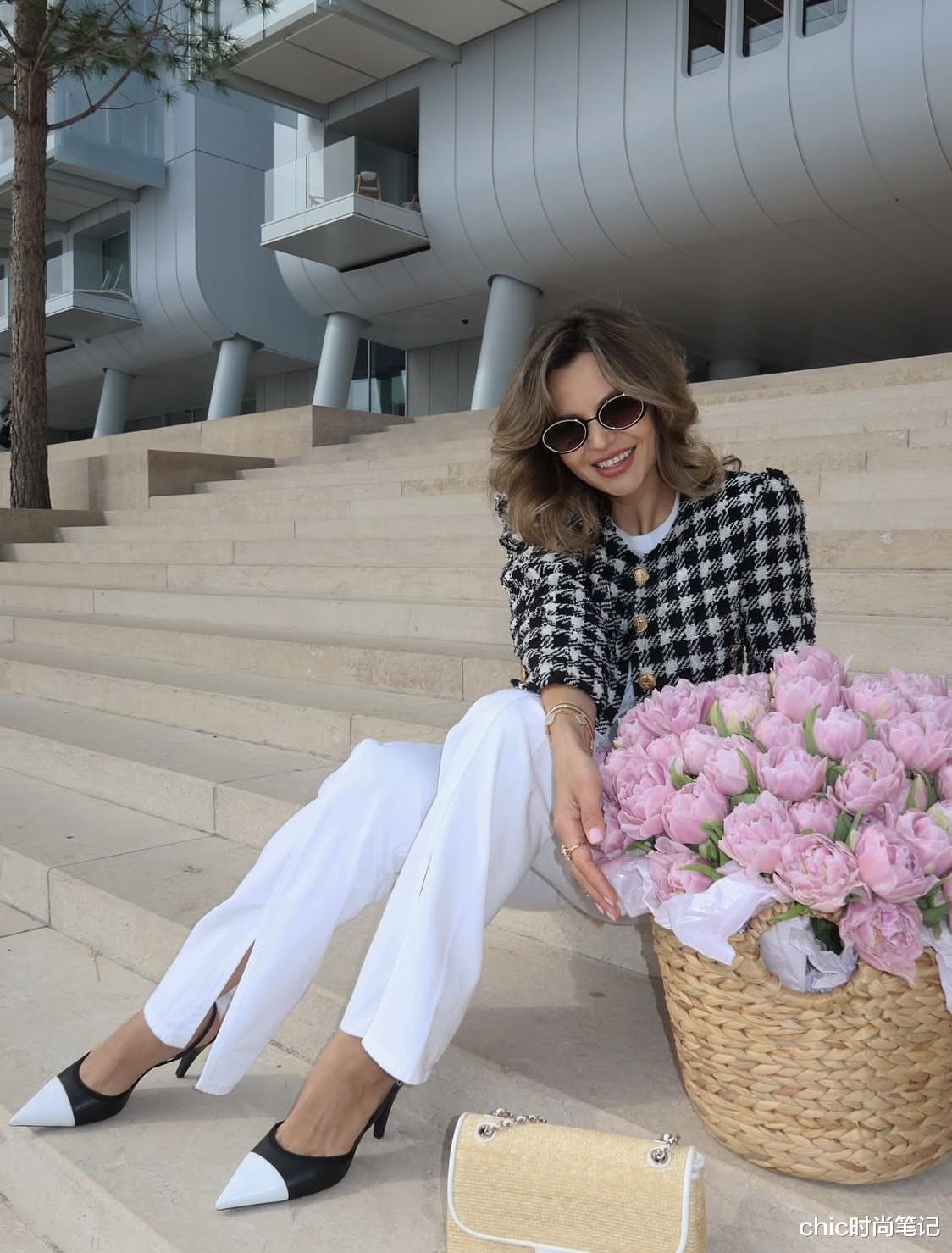 千鸟格纹小香风外套上点缀着金色花纹纽扣,复古与精致度极佳,配上白色长裤与黑白高跟鞋,墨镜是有效的穿搭点缀,拿捏老钱风。