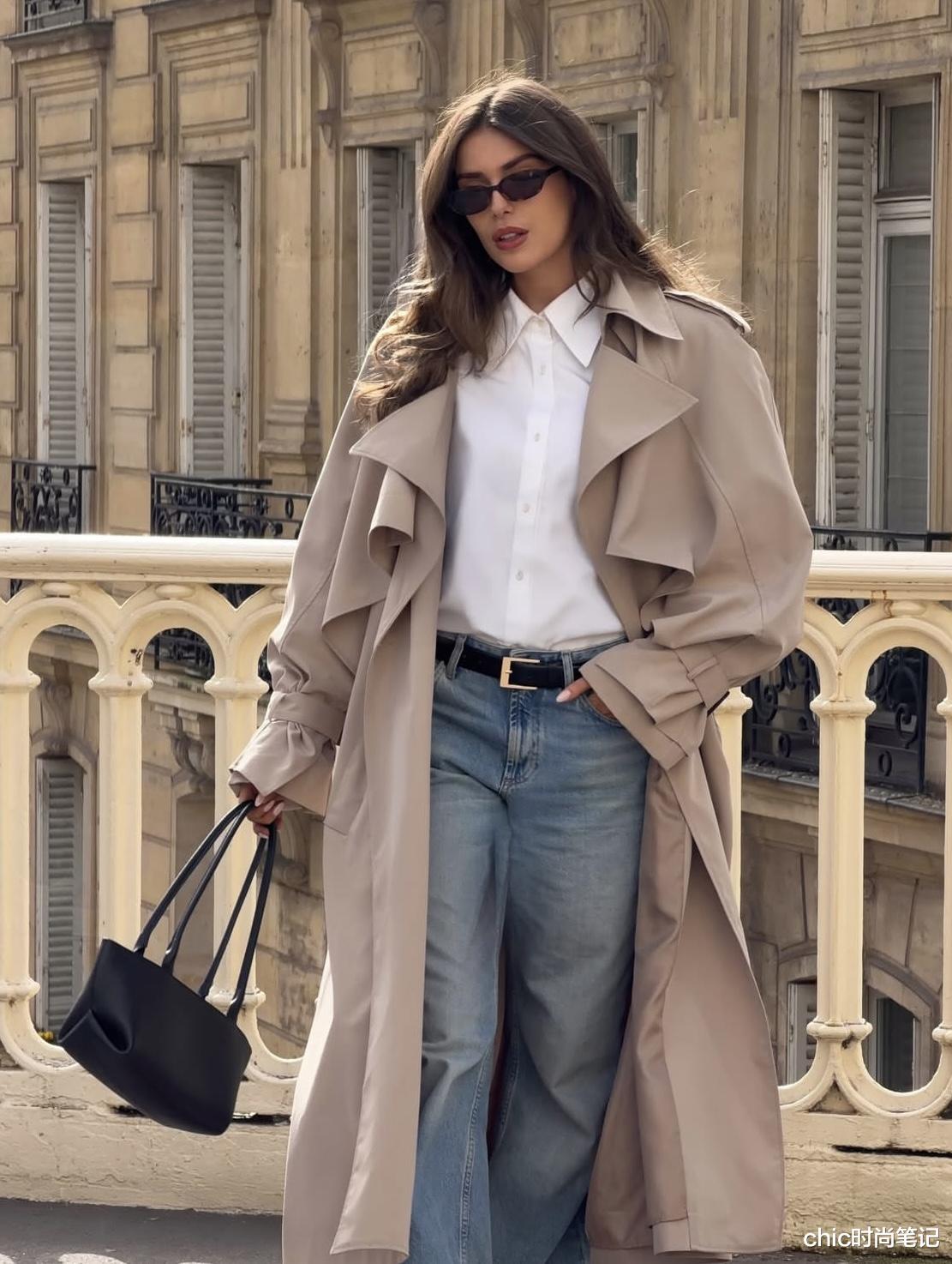 经典基础款的白衬衫加上浅色直筒牛仔裤,休闲和松弛感轻松get。叠穿一件卡其色风衣,风衣最能穿出老钱的优雅感,那种随性、洒脱的氛围感。