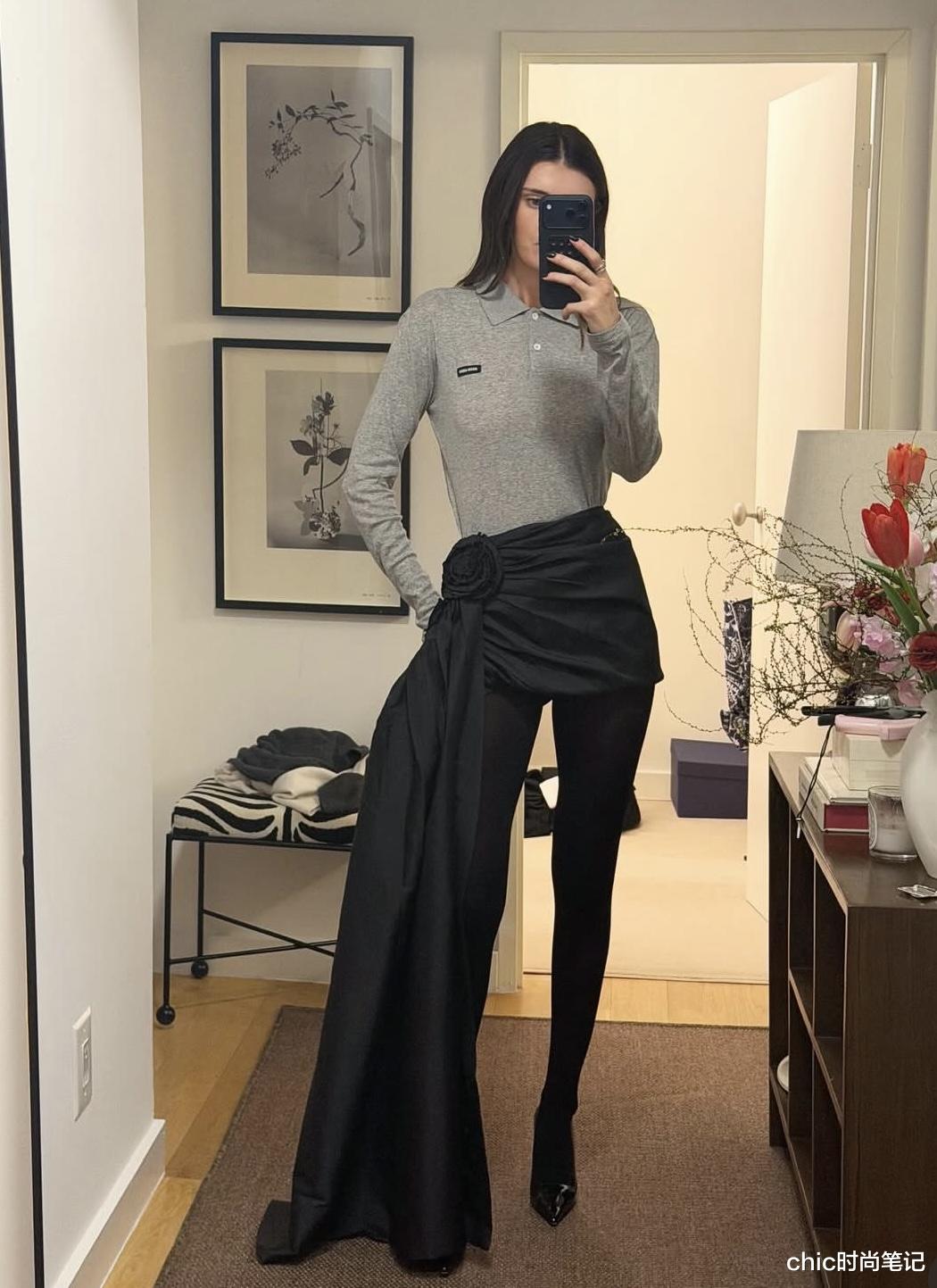 灰色极简风Polo上衣,搭配设计感缎面半身裙,短裙上设计着玫瑰花褶皱与侧拖尾,上衣的简约休闲与下衣的优雅知性形成强烈反差,极具个性与反差美。