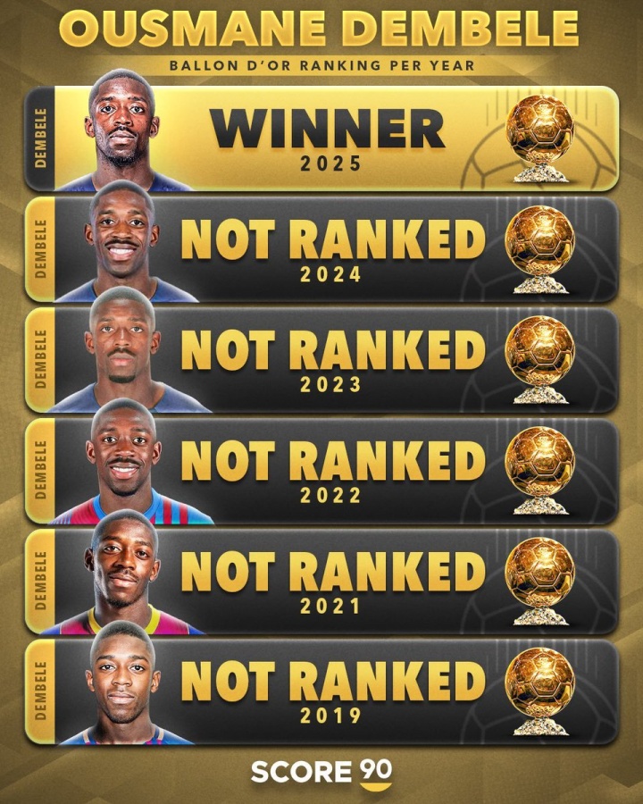 登贝莱过去5个赛季可是连金球奖提名都没有的,但现在却成了和乔治维阿一样首次获得提名就拿金球的人。
