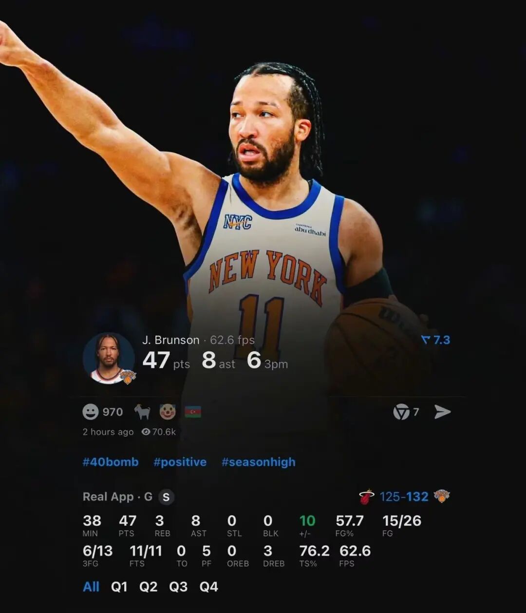 本场比赛,布伦森出战38分钟,26投15中,三分13中6,罚球11罚全中,贡献了47分8助攻0失误,得分创赛季新高。